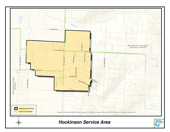 The District provides services to residents and businesses living and working in unincorporated Clark County and the City of Ridgefield. Affordable and reliable sewer service is provided to approximately 100,000 people throughout more than a 47 square-mile service area. The service area stems from the Hazel Dell neighborhood at the southern end more than 10 miles North along the Interstate 5 “Discovery Corridor” to the City of Ridgefield. Similarly, the area spans from the Felida neighborhood in the West, overlooking Vancouver Lake and the Columbia River, more than 10 miles East to the neighborhoods of Brush Prairie and Orchards. The District also serves the rural centers of Meadow Glade and Hockinson, situated near Battle Ground, Washington and the Cascade foothills. Some maps and basic statistics about our area and system are provided below.